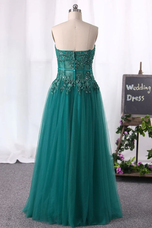 Strapless Party Dresses A Line Tulle With Applique And Slit
