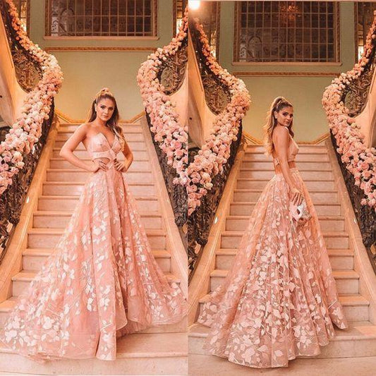 Princess Halter Backless Pink Lace Prom Dresses Appliques With Two Piece Floral Formal Dress
