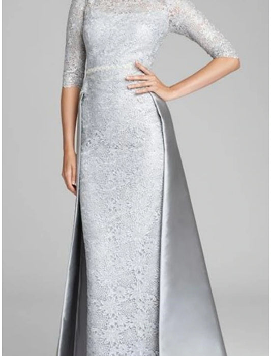 Sheath / Column Mother of the Bride Dress Wedding Guest Elegant Jewel Neck Floor Length Satin Lace Half Sleeve with Ruching Solid Color