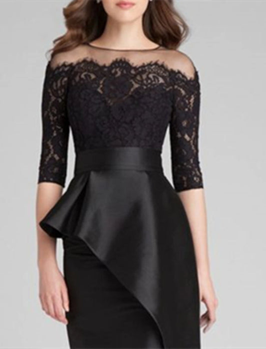 Mermaid / Trumpet Mother of the Bride Dress Wedding Guest Elegant Simple Jewel Neck Floor Length Satin Lace Half Sleeve with Ruffles Appliques