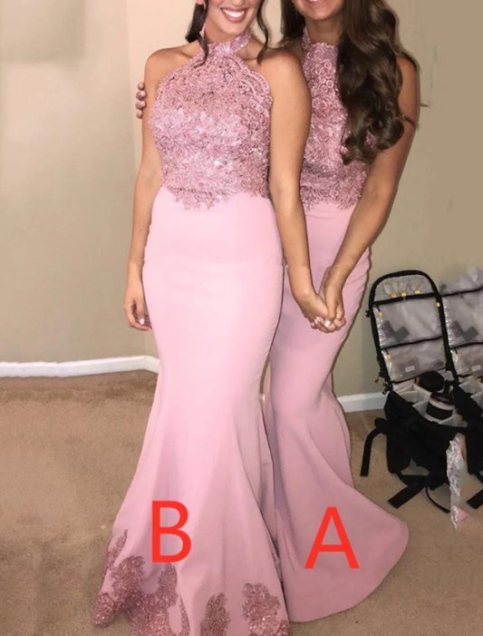 Mermaid / Trumpet Bridesmaid Dress Halter Sleeveless Beautiful Back Sweep / Brush Train Lace / Stretch Chiffon with Pleats / Solid Color