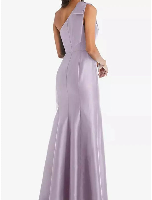 Sheath / Column Bridesmaid Dress One Shoulder Sleeveless Elegant Sweep / Brush Train Satin with Bow(s) / Solid Color