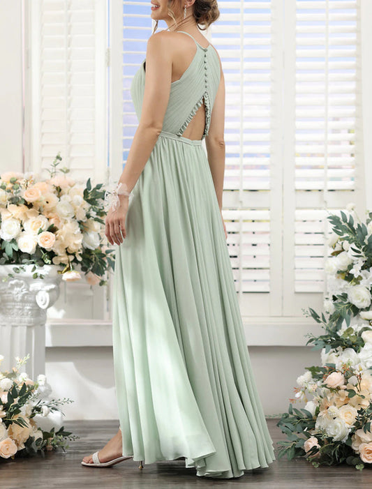 A-Line Bridesmaid Dress Halter Neck / V Neck Sleeveless Elegant Floor Length Chiffon with Split Front / Ruching / Solid Color