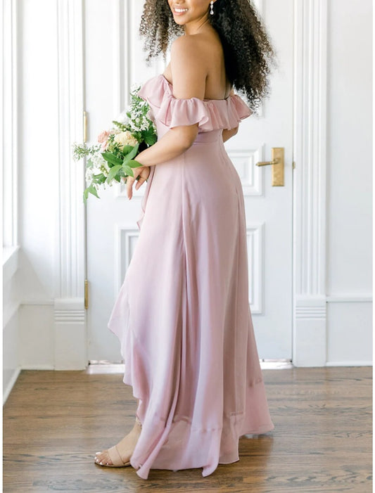 A-Line Bridesmaid Dress Off Shoulder Short Sleeve Elegant Asymmetrical Chiffon with Ruffles / Split Front / Ruching
