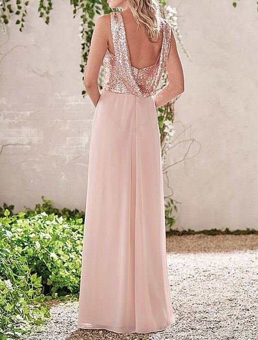 A-Line Bridesmaid Dress Scoop Neck / V Neck Sleeveless Elegant Floor Length Chiffon with Sequin / Ruching