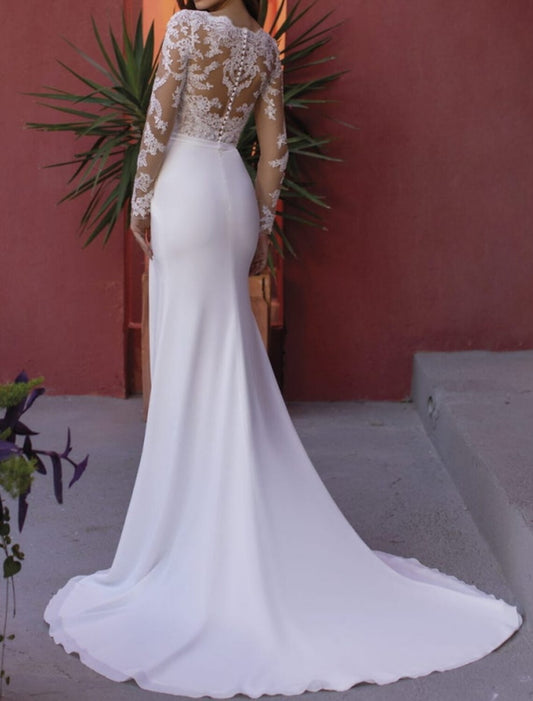 Hall Open Back Royal Style Formal Fall Wedding Dresses Sheath / Column V Neck Long Sleeve Court Train Stretch Fabric Bridal Gowns With Split Front Solid Color
