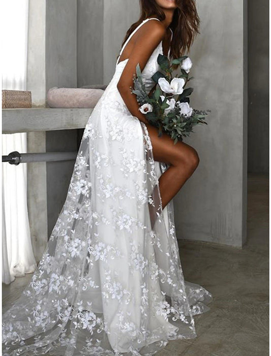 Beach Wedding Dresses A-Line Camisole V Neck Spaghetti Strap Court Train Lace Bridal Gowns With Appliques Split Front