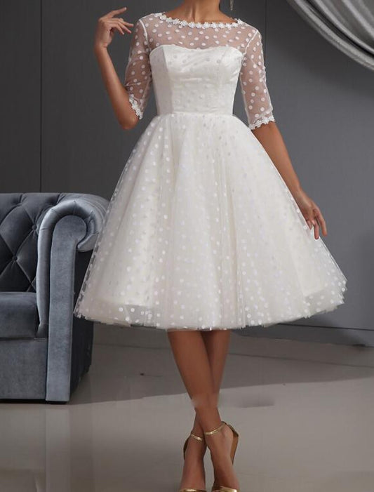 Bridal Shower Vintage 1940s / 1950s Little White Dresses Wedding Dresses A-Line Scoop Neck Half Sleeve Knee Length Tulle Bridal Gowns With Embroidery