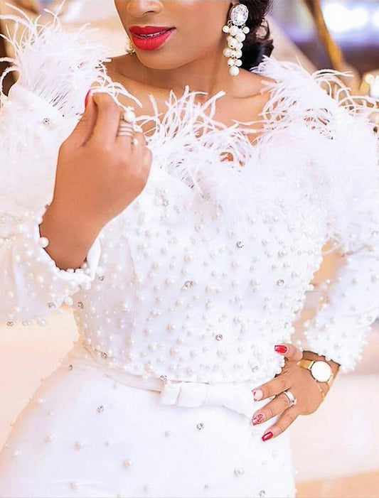 Bridal Shower Sparkle & Shine Little White Dresses Sexy Wedding Dresses Sheath / Column Off Shoulder Long Sleeve Ankle Length Sequined Bridal Gowns With Feathers / Fur Pearls