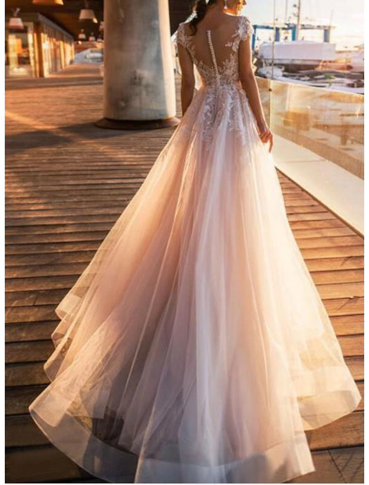 Beach Formal Wedding Dresses A-Line V Neck Cap Sleeve Floor Length Lace Bridal Gowns With Appliques