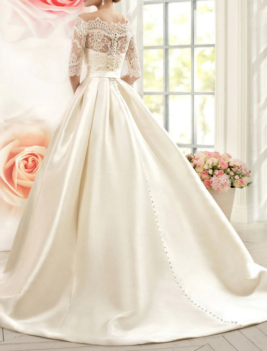 Hall Formal Fall Wedding Dresses A-Line Illusion Neck Half Sleeve Court Train Satin Bridal Gowns With Buttons Appliques Summer Wedding Party