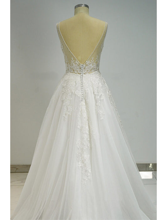 Engagement Formal Boho Wedding Dresses A-Line V Neck Sleeveless Court Train Lace Bridal Gowns With Beading Appliques