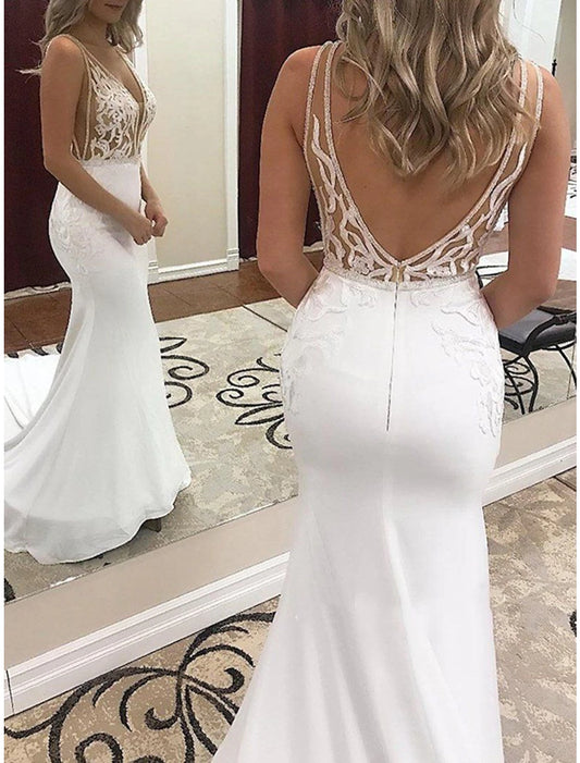 Engagement Open Back Sexy Formal Wedding Dresses Mermaid / Trumpet V Neck Sleeveless Court Train Lace Bridal Gowns With Appliques