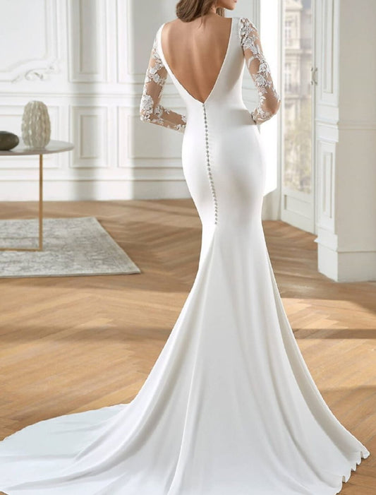 Beach Formal Wedding Dresses Mermaid / Trumpet Jewel Neck Long Sleeve Court Train Lace Bridal Gowns With Embroidery Appliques
