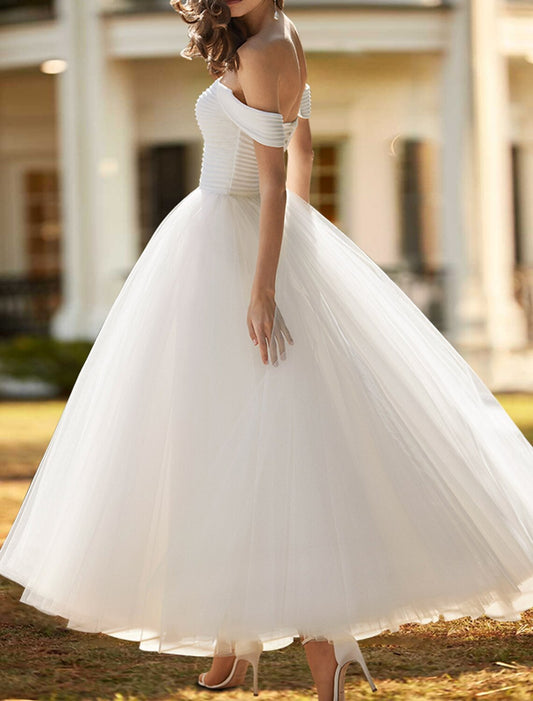 Bridal Shower Vintage 1940s / 1950s Little White Dresses Wedding Dresses Ball Gown Off Shoulder Cap Sleeve Ankle Length Chiffon Bridal Gowns With Ruched