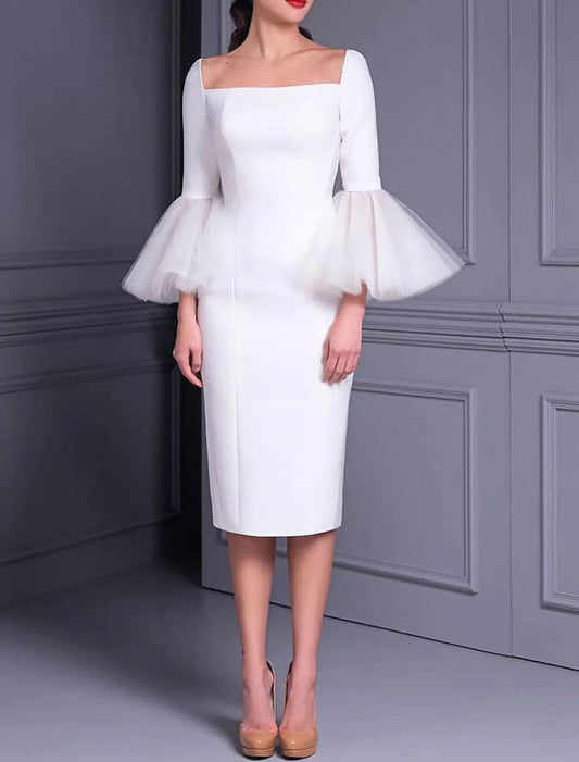 Reception Little White Dresses Casual Wedding Dresses Sheath / Column Square Neck Off Shoulder Long Sleeve Tea Length Tulle Bridal Suits Bridal Gowns With Solid Color