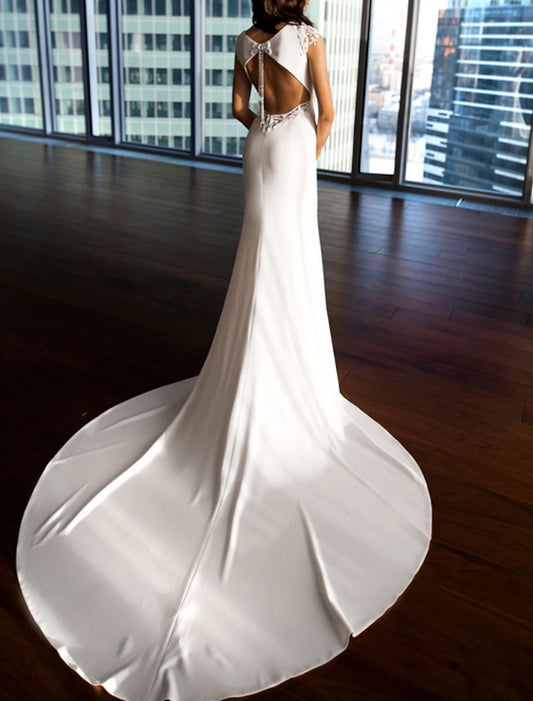 Hall Open Back Casual Wedding Dresses Sheath / Column Scoop Neck Cap Sleeve Chapel Train Stretch Fabric Bridal Gowns With Pearls