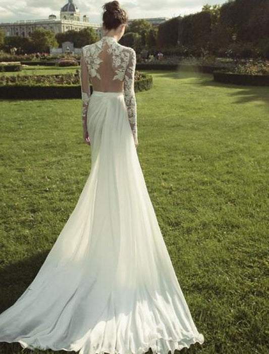 Beach Wedding Dresses A-Line High Neck Long Sleeve Court Train Chiffon Bridal Gowns With