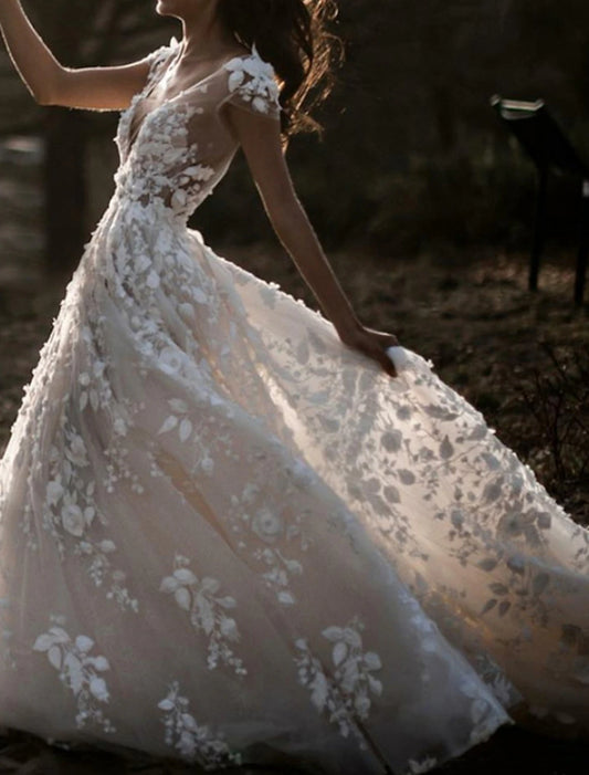 Beach Boho Wedding Dresses A-Line V Neck Cap Sleeve Court Train Lace Bridal Gowns With Appliques