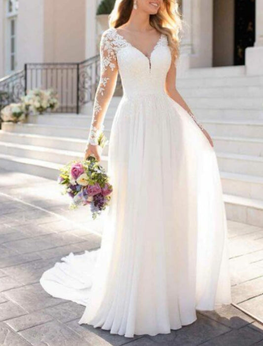 Beach Casual Wedding Dresses A-Line V Neck Long Sleeve Floor Length Chiffon Bridal Gowns With Solid Color
