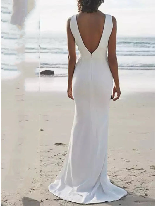 Beach Open Back Casual Wedding Dresses Sheath / Column Scoop Neck Sleeveless Sweep / Brush Train Stretch Fabric Bridal Gowns With Solid Color Summer Fall Wedding Party