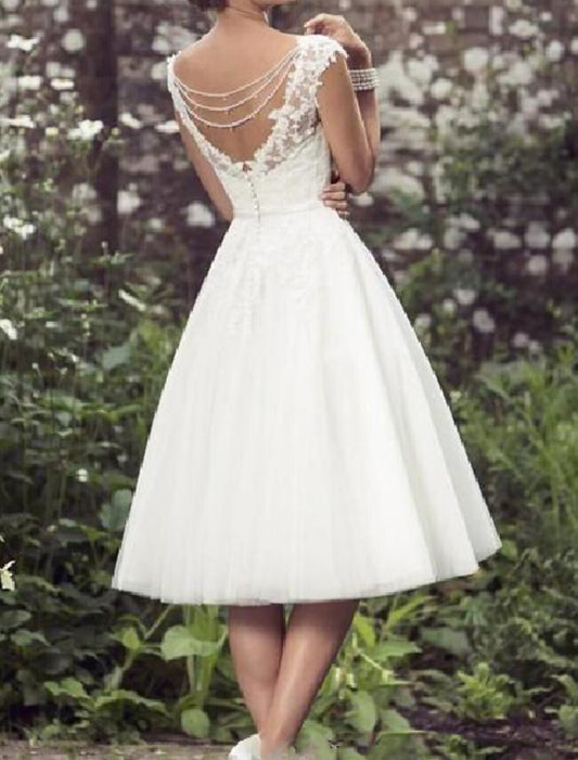 Reception Vintage 1940s / 1950s Little White Dresses Wedding Dresses A-Line V Neck Cap Sleeve Tea Length Lace Bridal Gowns With Lace Lace Insert