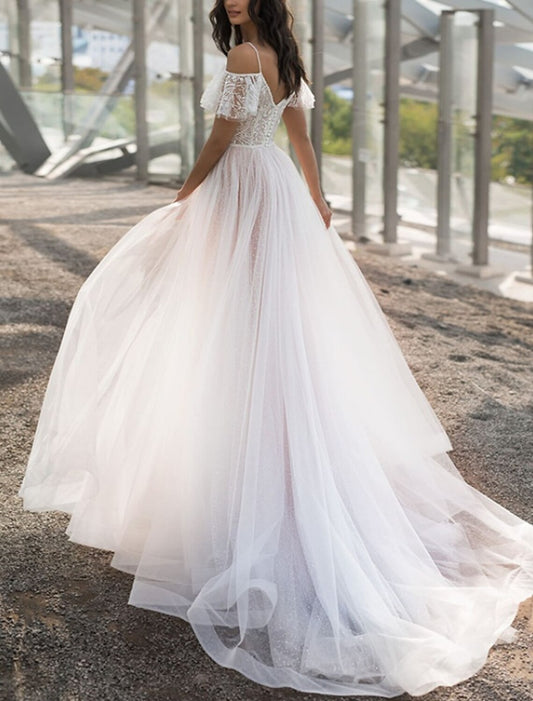 Beach Boho Wedding Dresses A-Line Off Shoulder Cap Sleeve Court Train Lace Bridal Gowns With Appliques Solid Color