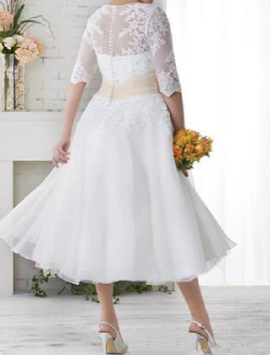 Reception Fall Wedding Dresses A-Line Illusion Neck V Neck Half Sleeve Tea Length Lace Bridal Gowns With Lace Appliques