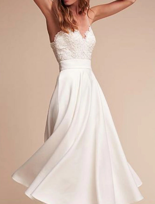 Reception Little White Dresses Wedding Dresses A-Line Sweetheart Camisole Spaghetti Strap Tea Length Satin Bridal Gowns With Lace Insert