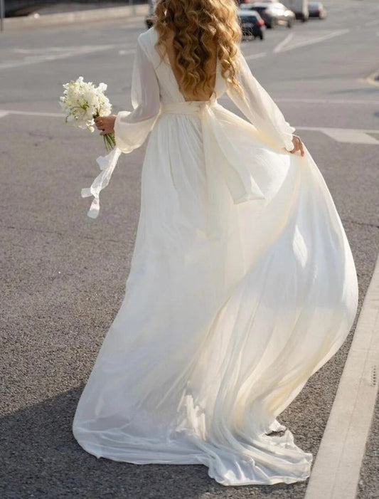 Beach Wedding Dresses A-Line V Neck Long Sleeve Sweep / Brush Train Chiffon Bridal Gowns With Split Front