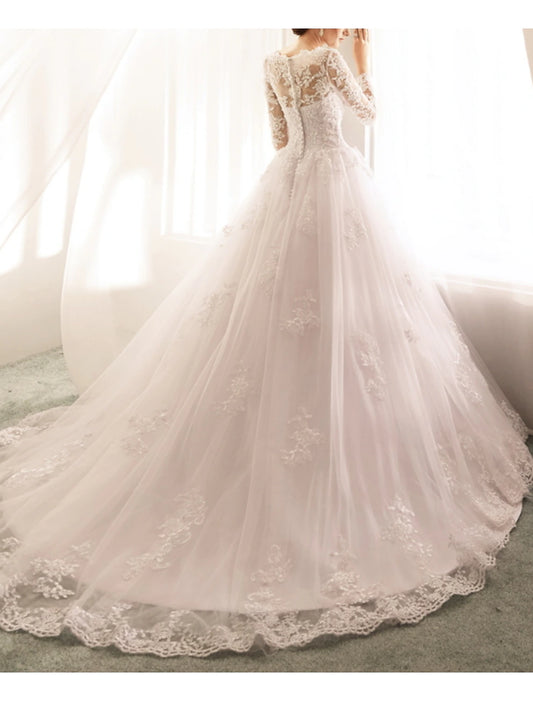 Engagement Formal Fall Wedding Dresses Ball Gown Illusion Neck Long Sleeve Court Train Lace Bridal Gowns With Appliques