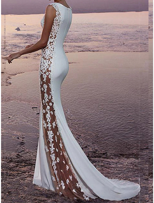 Beach Wedding Dresses Sheath / Column Scoop Neck Sleeveless Court Train Lace Bridal Gowns Party With Appliques