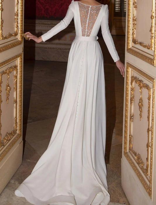 Hall Casual Wedding Dresses A-Line Jewel Neck Long Sleeve Floor Length Stretch Satin Bridal Gowns With
