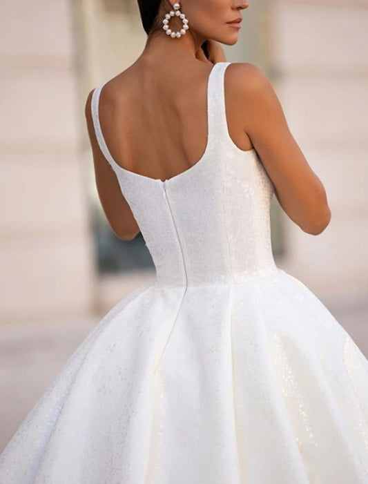 Hall Sparkle & Shine Casual Wedding Dresses A-Line Off Shoulder Cap Sleeve Sweep / Brush Train Sequined Bridal Gowns With Solid Color