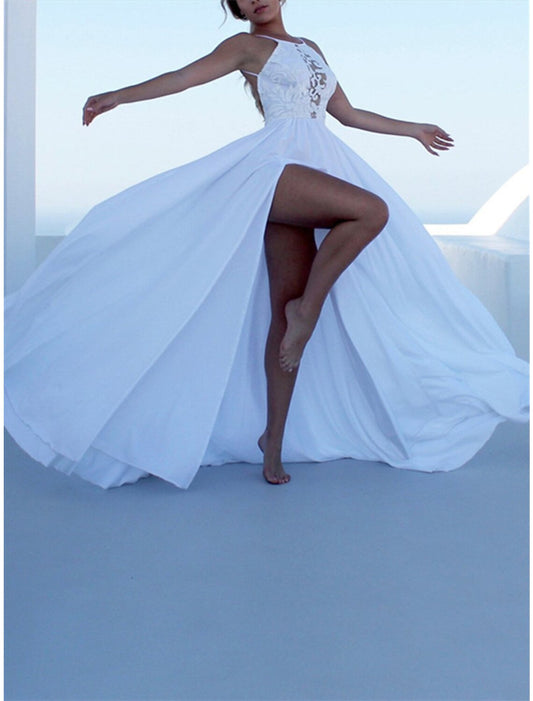 Beach Boho Wedding Dresses A-Line Halter Neck Spaghetti Strap Sleeveless Floor Length Chiffon Bridal Gowns With Appliques Split Front