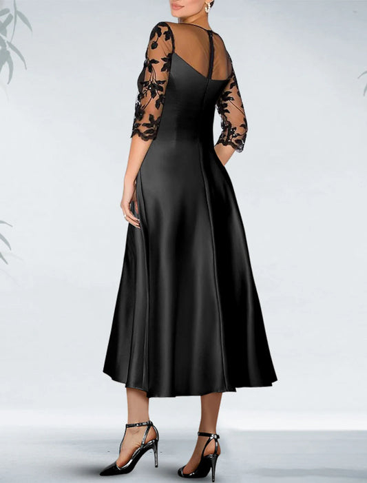 A-Line Cocktail Black Dress Plus Size Appliques Elegant Dress Fall Wedding Guest Dress For Mother Knee Length 3/4 Length Sleeve Off Shoulder Pocket Satin with Beading Pocket