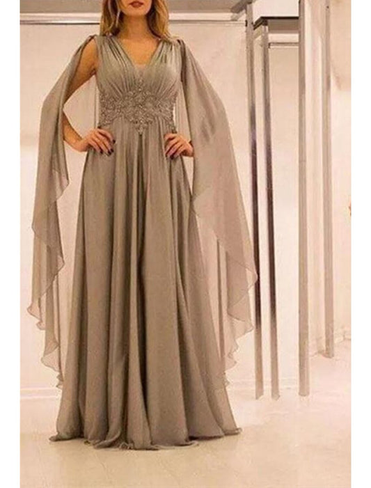 A-Line Mother of the Bride Dresses Plus Size Hide Belly Curve Open Back Fall Wedding Guest Dresses Formal Floor Length Short Sleeve V Neck Chiffon with Pleats Beading