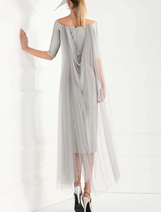 Sheath / Column Cocktail Dresses Minimalist Dress Party Wear Wedding Party Tea Length Half Sleeve Off Shoulder Capes Taffeta with Appliques