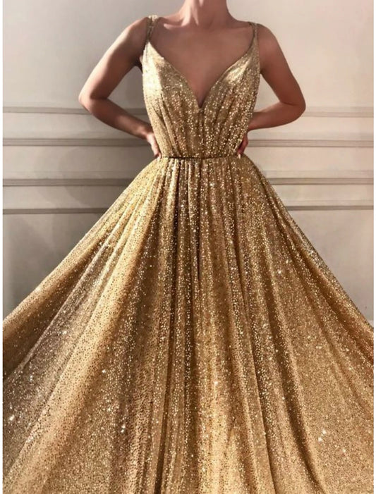 A-Line Prom Dresses Elegant Dress Formal Prom Sweep / Brush Train Sleeveless Spaghetti Strap Tulle with Sequin