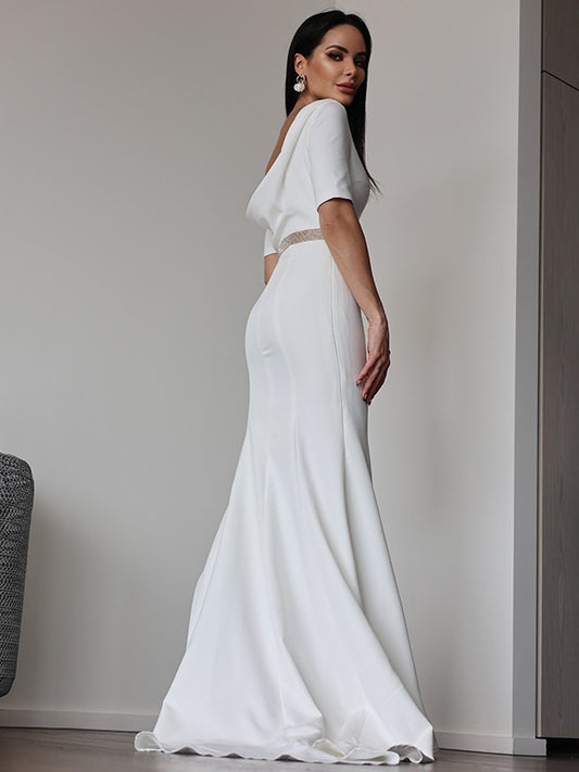 Sheath/Column Stretch Crepe Ruched Scoop 1/2 Sleeves Sweep/Brush Train Wedding Dresses