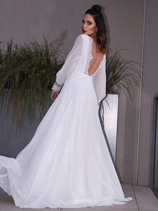 A-Line/Princess Chiffon Ruffles Long Sleeves Scoop Sweep/Brush Train Wedding Dresses