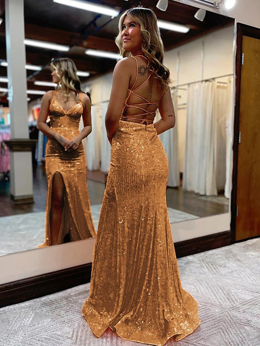 Sheath/Column Sequins Lace Spaghetti Straps Sleeveless Sweep/Brush Train Dresses