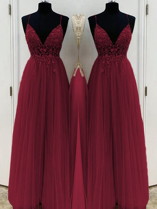 A-Line/Princess V-neck Tulle Applique Sleeveless Floor-Length Dresses