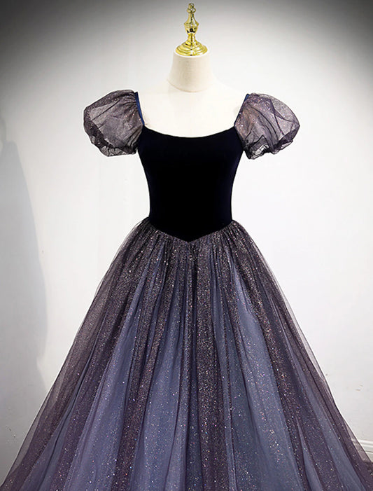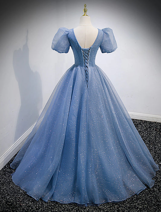 Ball Gown Prom Dresses Cute Dress Engagement Prom Floor Length Short Sleeve Square Neck Tulle with Sequin Splicing