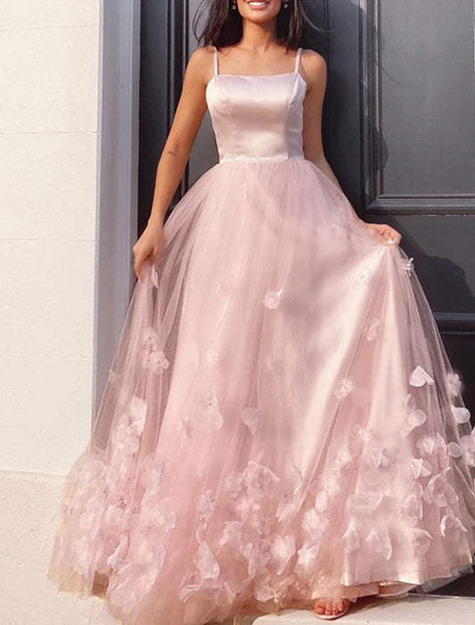 A-Line Prom Party Dress Floral Dress Performance Sweet 16 Floor Length Sleeveless Spaghetti Strap Tulle with Pleats Appliques