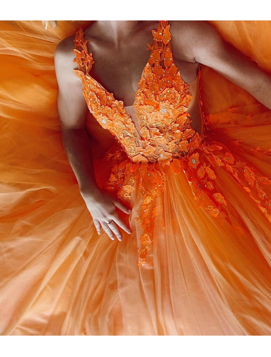 A-Line Prom Dresses Cut Out Dress Engagement Prom Sweep / Brush Train Sleeveless V Neck Tulle Backless V Back with Appliques