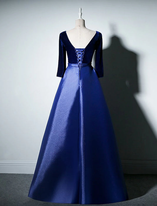 A-Line Mother of the Bride Dress Simple Elegant V Neck Floor Length Taffeta Velvet Long Sleeve with Pleats