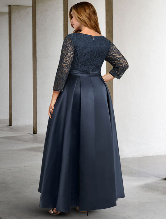 A-Line Mother of the Bride Dresses Plus Size Hide Belly Curve Elegant Dress Formal Asymmetrical 3/4 Length Sleeve V Neck Satin with Pleats Ruched