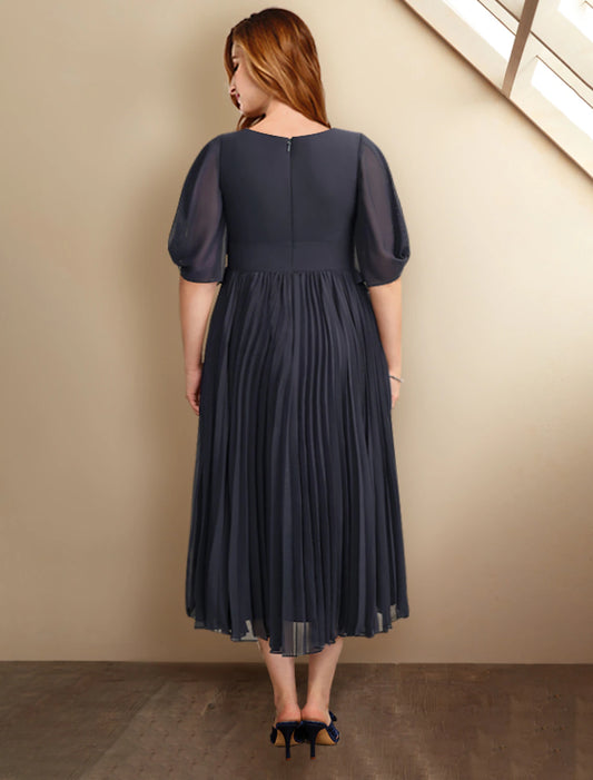 A-Line Mother of the Bride Dresses Plus Size Hide Belly Curve Elegant Dress Formal Tea Length Short Sleeve V Neck Chiffon with Pleats