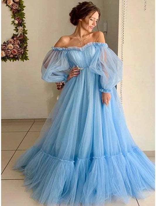 A-Line Minimalist Elegant Engagement Prom Dress Off Shoulder Long Sleeve Floor Length Tulle with Pleats Appliques